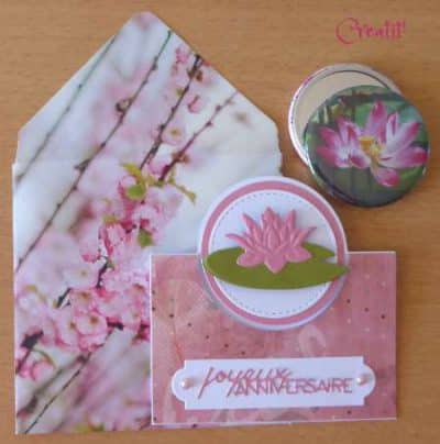 Un aperçu de l’envoi global avec un petit miroir de poche avec une photo de lotus prise lors de mon voyage en Asie l’été dernier.