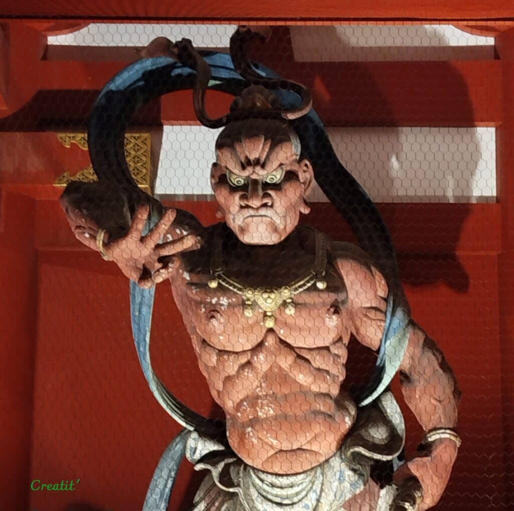 Statue de Nio, gardien traditionnel du Bouddhisme japonais, arborant un visage menaçant et chargé d’empêcher les démons de pénétrer les lieux.