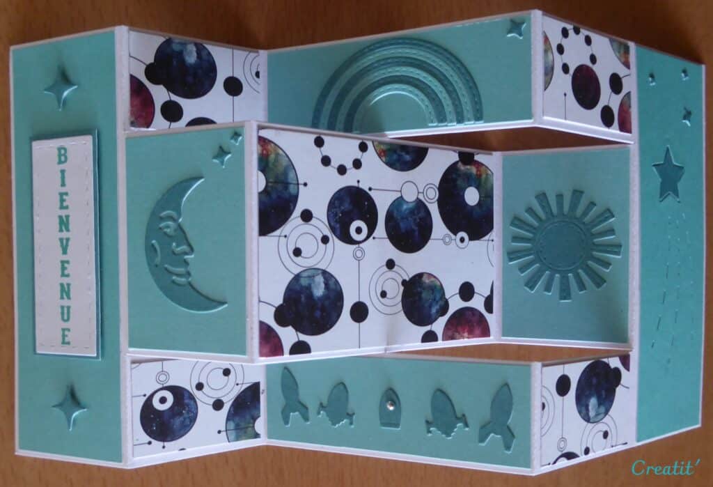 Dans ce coffret, il y a un gabarit avec une nouvelle technique, des tampons, des papiers, des décors permettant d’aller avec le plus grand nombre de photos.